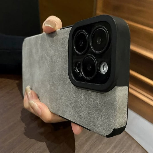 Stylish two-tone denim iPhone case featuring a durable design with a mix of light and dark denim fabric.